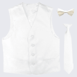Experience elegance and comfort at its finest with this three-piece white satin vest set for boys. Made with a soft satin-like material, this set features four front buttons and two front pockets. It also comes with a convenient bow tie with an attached elastic band and a clip on neck tie, making it perfect for any formal occasion. The product also requires dry cleaning, ensuring its long-lasting quality.