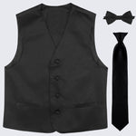 Experience elegance and comfort at its finest with this three-piece black satin vest set for boys. Made with a soft satin-like material, this set features four front buttons and two front pockets. It also comes with a convenient bow tie with an attached elastic band and a clip on neck tie, making it perfect for any formal occasion. The product also requires dry cleaning, ensuring its long-lasting quality.