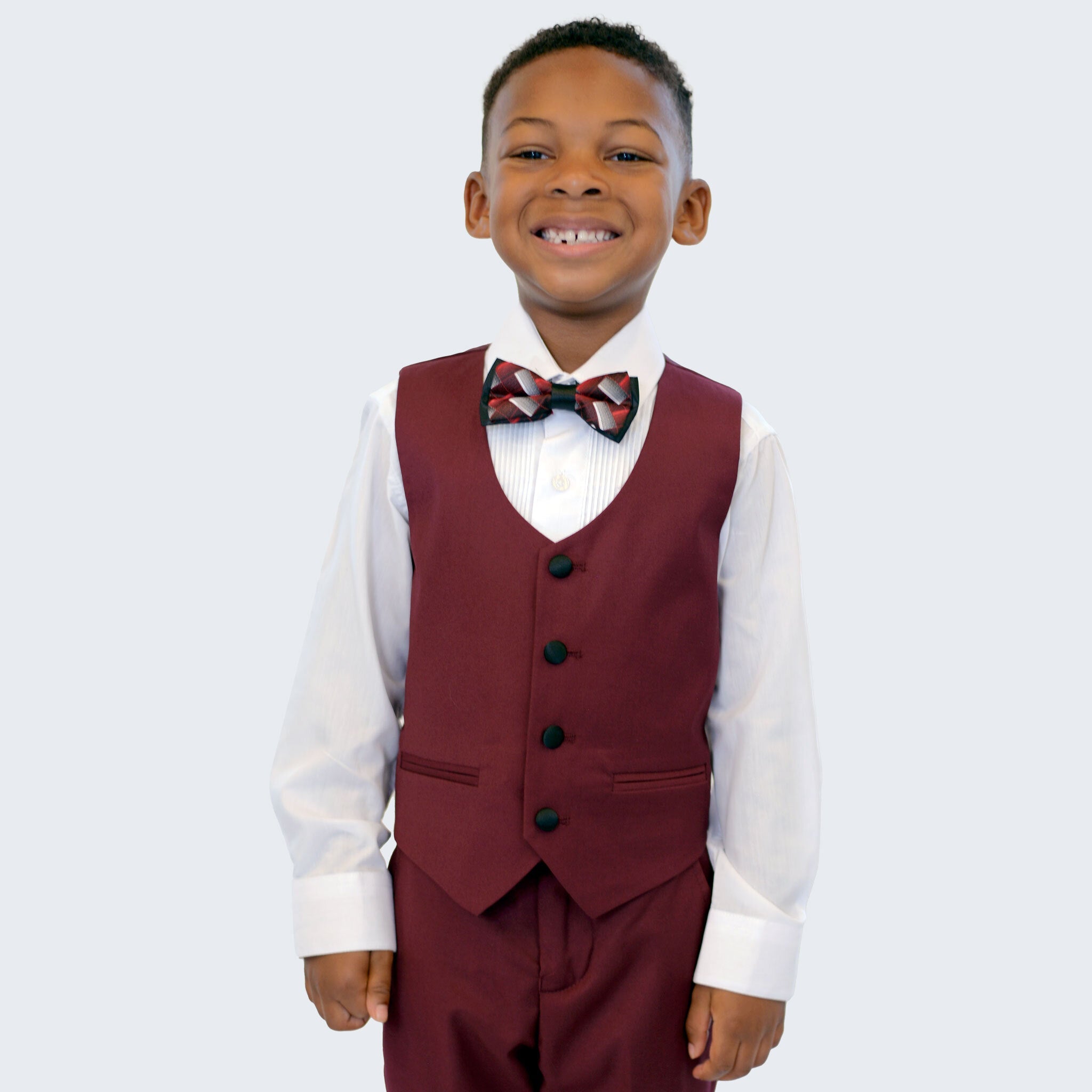 Boys burgundy tuxedo 5-piece set by Stacy Adams. Slim Fit. Set includes: jacket, pants, vest, dress shirt, and bowtie.  High quality boys tuxedo. Made of exceptional Poly/Rayon blend fabric (65% polyester, 35% rayon). Perfect for weddings, parties, or any other formal event. Product should be dry cleaned. Add optional boys black tuxedo shoes or find shoes here.