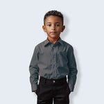Boy's formal charcoal laydown collar long sleeve dress shirt. This dress shirt is made of a polyester/cotton blend material. Front Pocket.  Have your child looking their best in this classic fit, comfortable, and easy to wear tuxedo shirt. Buttons are specially made to withstand numerous laundering and pressings. Machine washable. For sizing details view sizing chart.