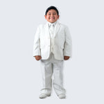 Boy's husky white suit 5-piece set. Husky Fit. Set includes: coat, pants, vest, dress shirt, and necktie. High quality boys suit. Made of exceptional Poly/Rayon blend fabric (65% polyester, 35% rayon). Perfect for weddings, parties, or any other formal event. Product should be dry cleaned. Notice: The husky suits tend to run a little big, please be sure to reference the sizing chart before placing your order. You can find the tab "Sizing Chart" above this product description. Add optional boys black tuxedo shoes or find shoes here.