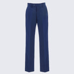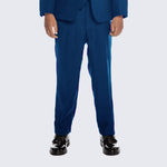 These boy's indigo slim fit pants feature a zip fly with hook closure, belt loops, and two side pockets. It also comes with two back pockets with button closure, hemmed/concealed adjustable waist . Perfect to match with a tuxedo or suit jacket. Made from  65% Polyester / 35% Viscose.