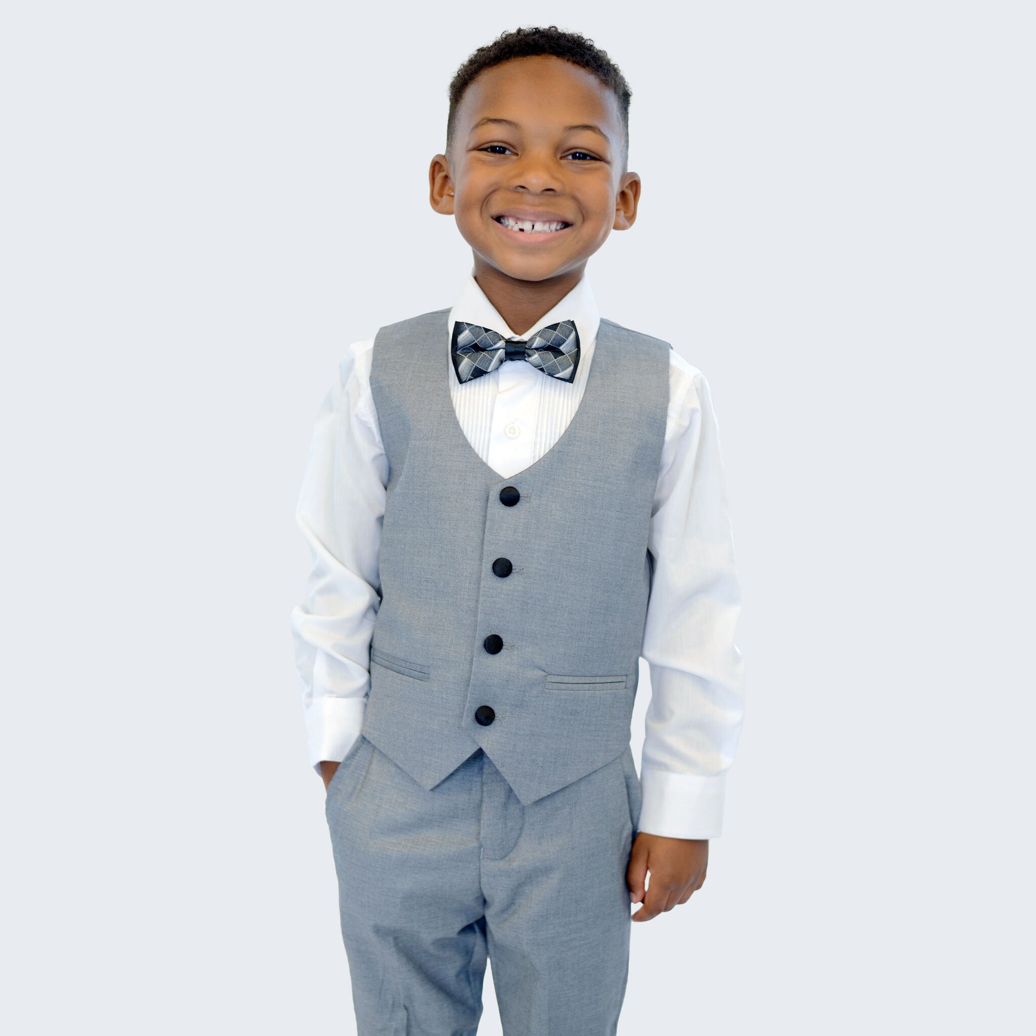 Boys mid gray tuxedo 5-piece set by Stacy Adams. Slim Fit. Set includes: jacket, pants, vest, dress shirt, and bowtie.  High quality boys tuxedo. Made of exceptional Poly/Rayon blend fabric (65% polyester, 35% rayon). Perfect for weddings, parties, or any other formal event. Product should be dry cleaned. Add optional boys black tuxedo shoes or find shoes here.