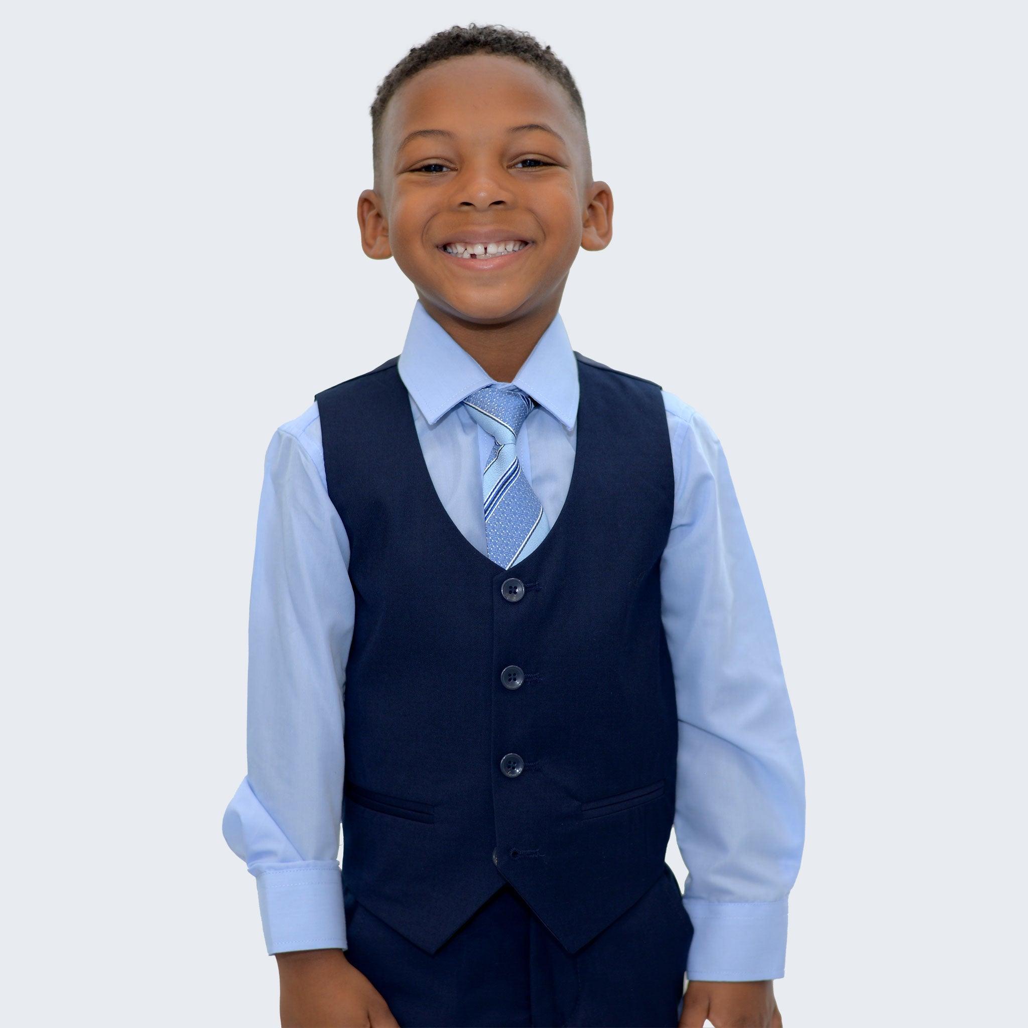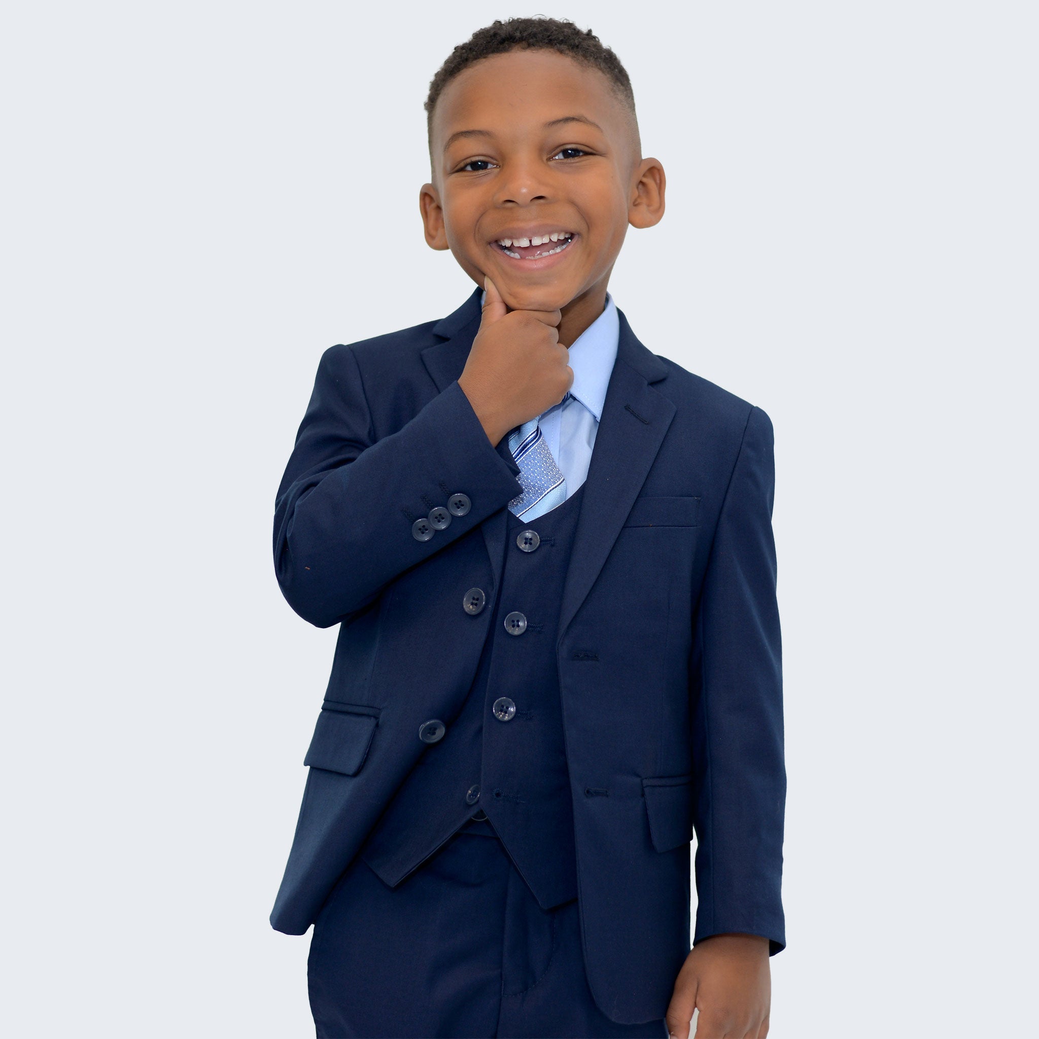 Boys navy blue suit 5-piece set by Stacy Adams. Slim Fit. Set includes: coat, pants, vest, dress shirt, and necktie (tie pattern can vary).  High quality boys suit. Made of exceptional Poly/Rayon blend fabric (65% polyester, 35% rayon). Perfect for weddings, parties, or any other formal event. Product should be dry cleaned. Add optional boys black tuxedo shoes or find shoes here.