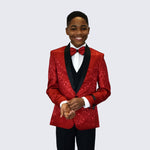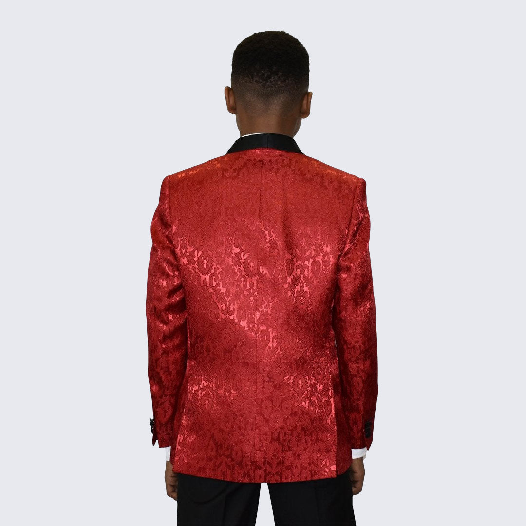 Boys red fancy pattern tuxedo 5-piece set. Modern Fit. Set includes: coat, pants, vest, dress shirt, and bow tie. Available sizes for toddlers to teens. High quality boys tuxedo. Made of exceptional Poly/Rayon blend fabric (65% polyester, 35% rayon). Perfect for holiday and Christmas season, weddings, parties, or any other formal event. Product should be dry cleaned. Add optional boys black tuxedo shoes or find shoes here.