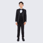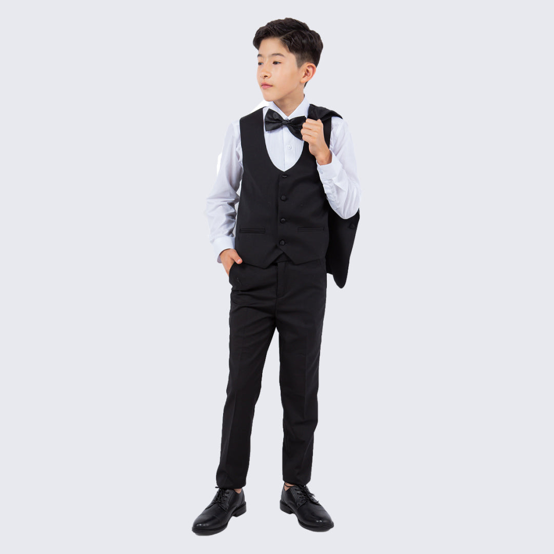 Boys black tuxedo with black shawl lapel by Perry Ellis. 5-piece set.  Slim Fit. This modern and high end tuxedo is made of a luxurious rayon viscose/ dacron blend fabric that looks and feels like super 100 wool. Coat has a one covered button front closure with shawl satin lapel. Side vents. Jacket has two front pockets and one chest pocket. Jacket pockets are usable but come sewn shut. Gently cut open to use. Tetron silk lining. Very high quality and well constructed. Comes with black tapered trousers. Elastic waistband (sizes 2-7). Larger sizes (sizes 8-20) have an expandable waistband for additional comfort. Pants are lined to the knee. Pleated laydown tuxedo shirt, vest, and bow tie included. Add optional boys black tuxedo shoes or find shoes here.