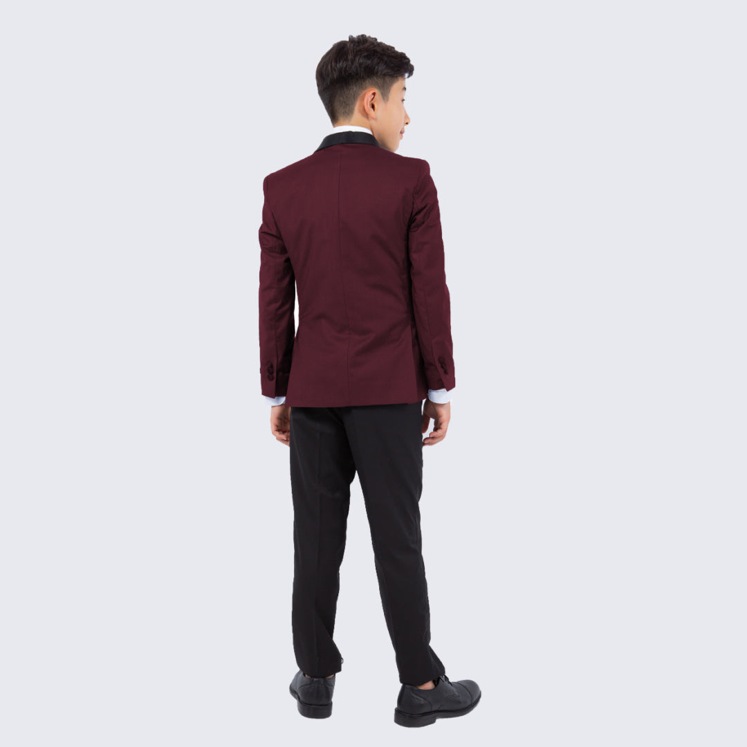 Boys burgundy tuxedo with black shawl lapel by Perry Ellis. 5-piece set.  Slim Fit. This modern and high end tuxedo is made of a luxurious rayon viscose/ dacron blend fabric that looks and feels like super 100 wool. Coat has a one covered button front closure with shawl satin lapel. Side vents. Jacket has two front pockets and one chest pocket. Jacket pockets are usable but come sewn shut. Gently cut open to use. Tetron silk lining. Very high quality and well constructed. Comes with black tapered trousers. Elastic waistband (sizes 2-7). Larger sizes (sizes 8-20) have an expandable waistband for additional comfort. Pants are lined to the knee. Pleated laydown tuxedo shirt, vest, and bow tie included. Add optional boys black tuxedo shoes or find shoes here.