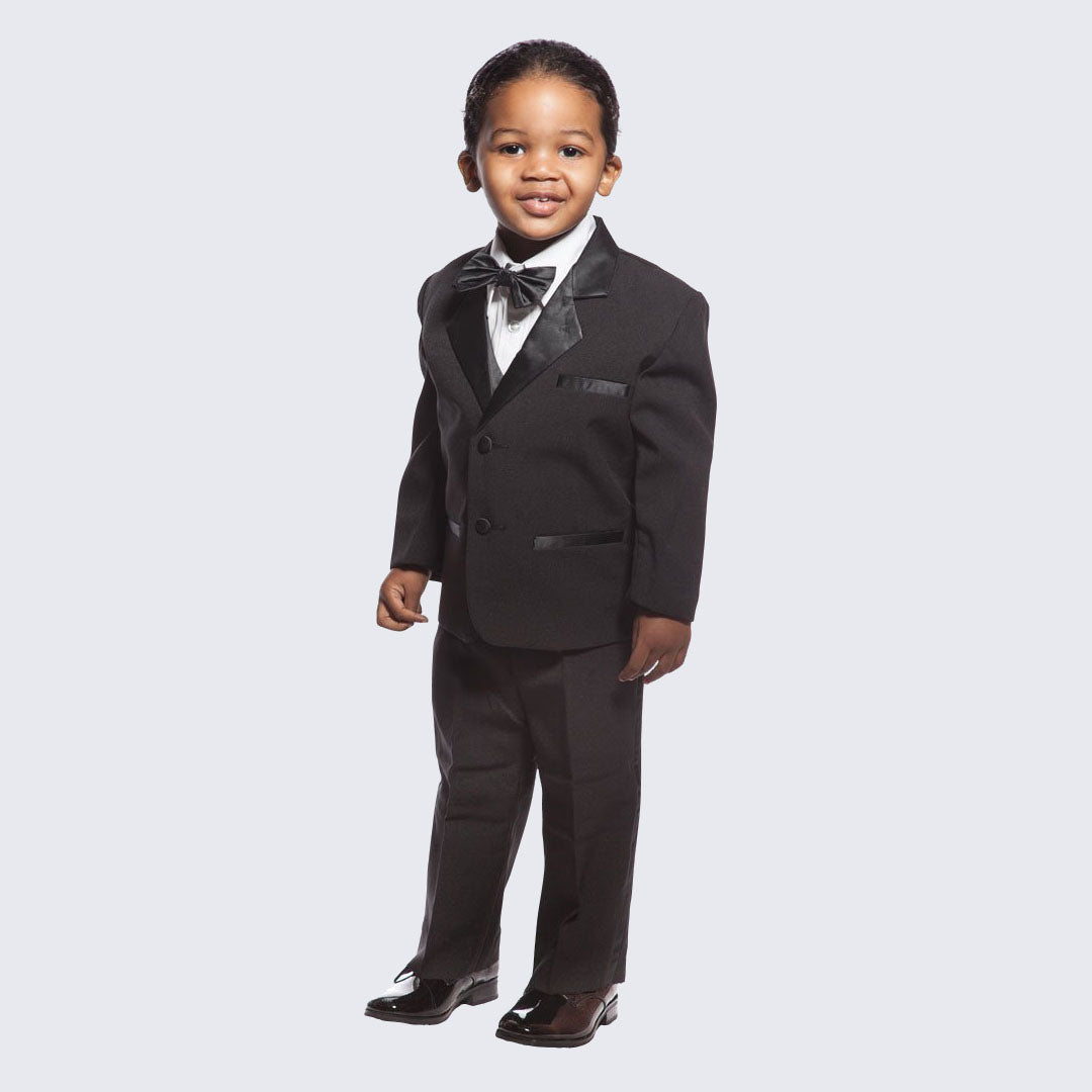 Boy's black tuxedo package. 5-Piece Set that includes: coat, pants, shirt, vest, and bow tie. Available sizes for babies, infants, toddlers, young boys, and teens. 100% polyester. Perfect for weddings (ring bearers), or any other formal event. Items with satin should be dry cleaned. Add optional boys black tuxedo shoes or find shoes here.