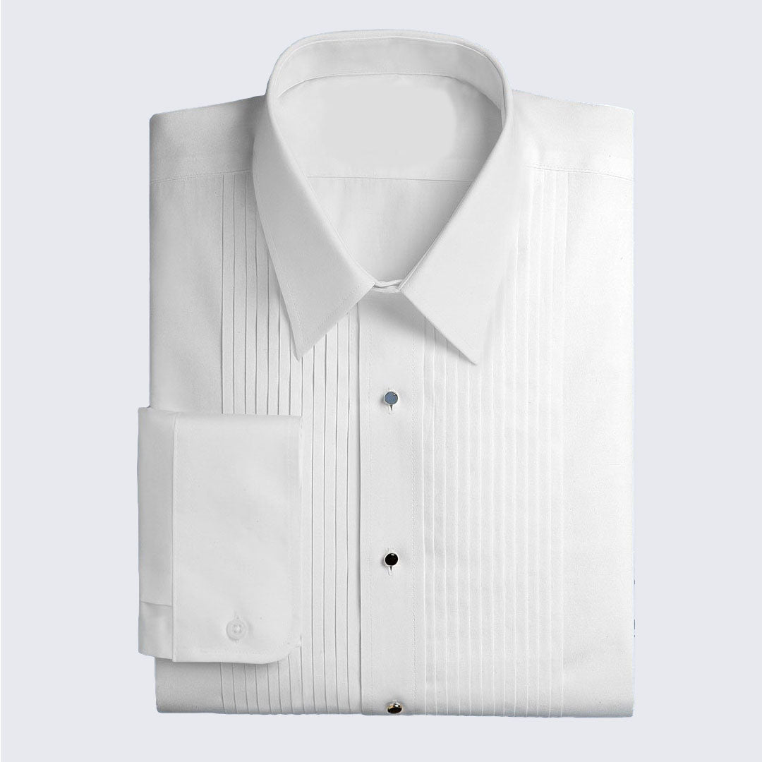 Boy's formal white laydown collar tuxedo shirt with a 1/4" pleated front. This traditional tuxedo shirt is made of a polyester/cotton blend material. Convertible stud front and barrel cuffs. Shirt can be worn with or without cufflinks and studs. Have your child looking their best in this classic fit, comfortable, and easy to wear tuxedo shirt. Buttons are specially made to withstand numerous laundering and pressings. Machine washable. Available from size boys extra small to boys large. For sizing details view sizing chart.
