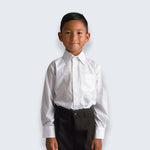 Boy's formal white laydown collar long sleeve dress shirt. This dress shirt is made of a polyester/cotton blend material. Front Pocket.  Have your child looking their best in this classic fit, comfortable, and easy to wear tuxedo shirt. Buttons are specially made to withstand numerous laundering and pressings. Machine washable. For sizing details view sizing chart.