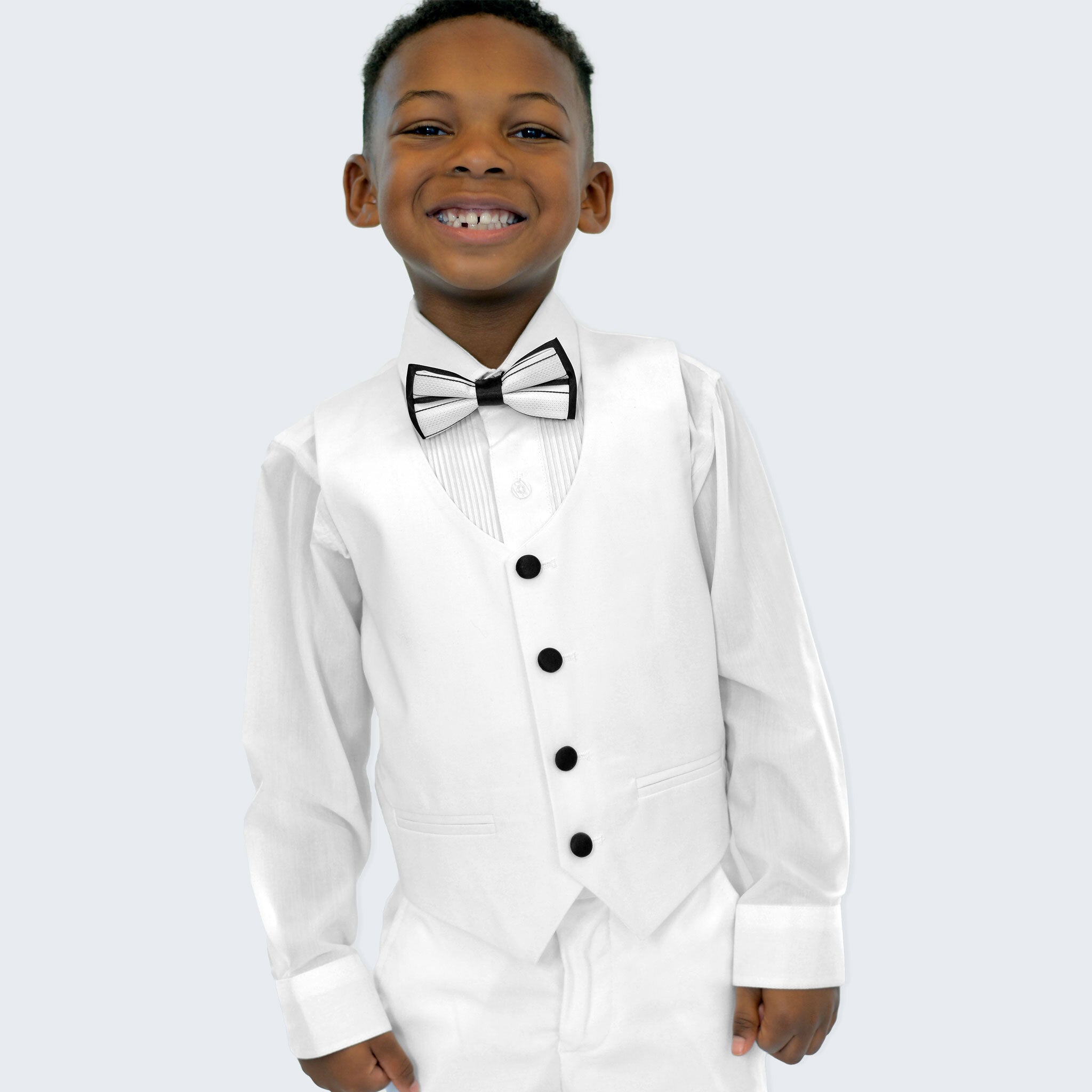 Boys white tuxedo 5-piece set by Stacy Adams. Slim Fit. Set includes: jacket, pants, vest, dress shirt, and bowtie.  High quality boys tuxedo. Made of exceptional Poly/Rayon blend fabric (65% polyester, 35% rayon). Perfect for weddings, parties, or any other formal event. Product should be dry cleaned.  Add optional boys black tuxedo shoes or find shoes here.