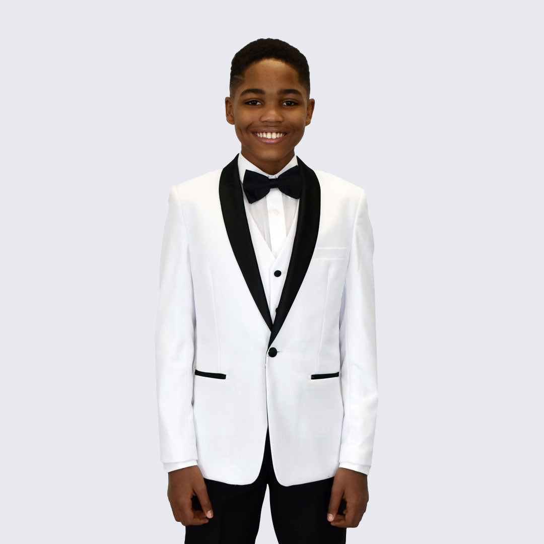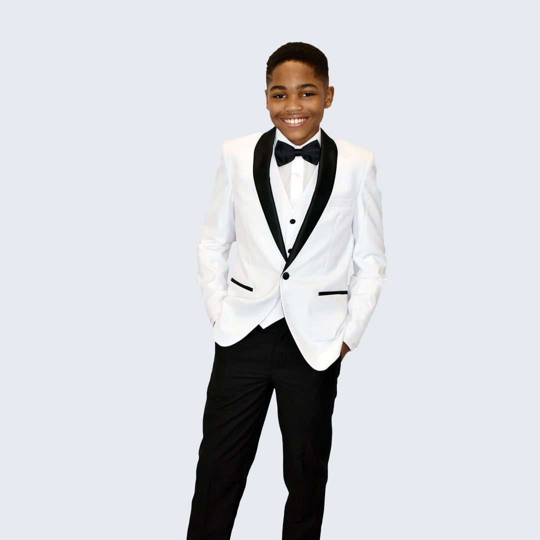 Boys white tuxedo with black shawl lapel 5-piece set. Slim Fit. This fashionable tuxedo is made of a luxurious poly/ viscose blend fabric that looks and feels like super 100 wool. Coat has a one covered button front closure with shawl satin lapel. Side vents. Jacket has two front pockets and one chest pocket. Chest pocket is usable but come sewn shut. Gently cut open to use. Polyester lining. Very high quality and well constructed. Comes with plain-front tapered trousers. Pants have an inside adjustable elastic waistband for additional comfort. Pants are lined to the knee. Set includes: Jacket, pants, white dress shirt, your choice of a black bow tie or necktie, and matching four button vest. Add optional boys black tuxedo shoes or find shoes here.